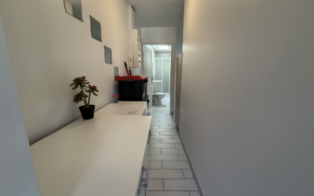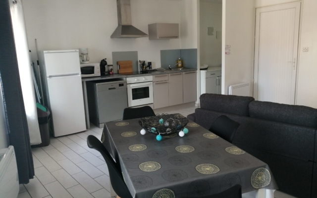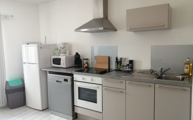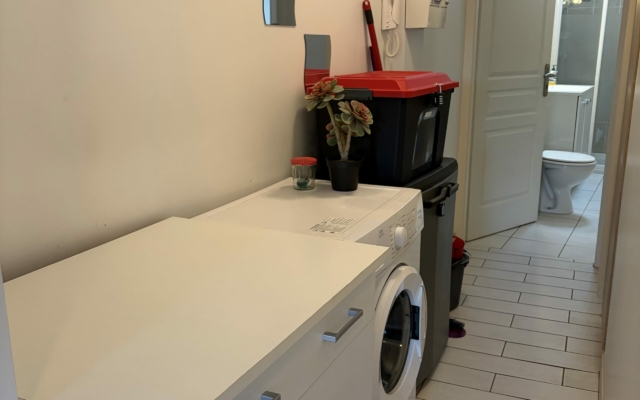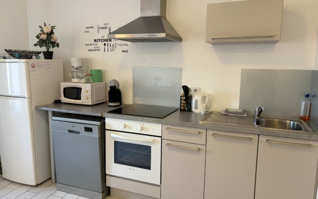 – d’une cuisine équipée avec plaque induction, four, micro-onde, cafetière DOLCE GUSTO, cafetière filtre, bouilloire, grille-pain, frigo+congélateur, lave vaisselle et lave linge,